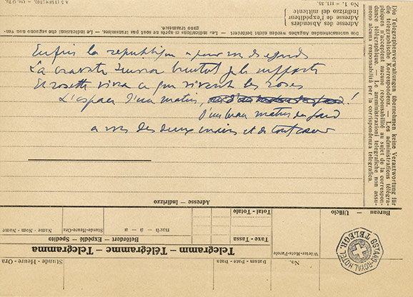 Poème autographePoème autographe (brouillon) adressé à Maurice Martin du Gard. [Gstaad février 1935 ?]; 1 page oblongue in-8° d'une formule de télégramme avec cachet du Gstaad Royal Hotel. ...