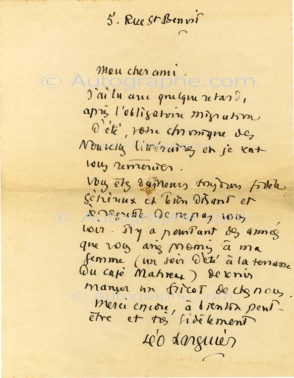 Lettre autographe signéeLettre autographe signée, adressée à Jean-Jacques Brousson. 1 page in-4°. « J’ai lu avec quelque retard, après l’obligatoire migration d’été, votre chronique des Nouvelles littéraires et je vient vous remercier. Vous êtes...