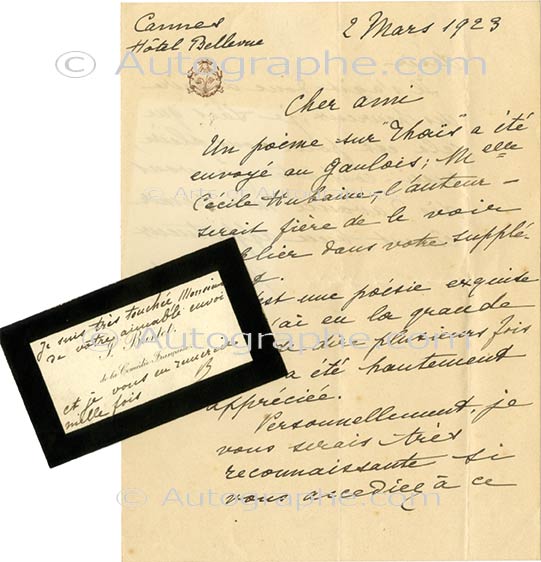 Lettre autographe signéeLettre autographe signée. Cannes, 2 mars 1923 ; 1 page 1/2 in-8°. « Un poème sur Thaïs a été envoyé au Gaulois ; Mlle Cécile Hubaine, l’auteur serait fière de le voir publier dans votre supplément. C’est une poésie exquise...