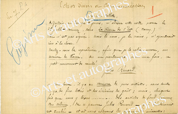 Lettre autographe signéeLettre autographe signée, adressée à M. Valette. Sans date ; 1 page in-4°. « A. Gallois, qui découpe toujours, m’adresse cette note parue le 25 juillet dernier, dans la Revue de l’Est (Nancy). Elle n’est pas signée. Mais le...