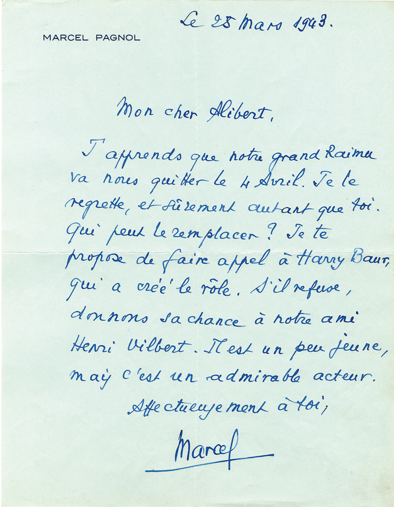 Lettre autographe signéeLettre autographe signée, adressée à Alibert. 25 mars 1943 ; 1 page in-4° sur papier à son nom gravé.« J’apprends que notre grand Raimu va nous quitter le 4 avril. Je le regrette, et sûrement autant que toi. Qui peut le remplacer...