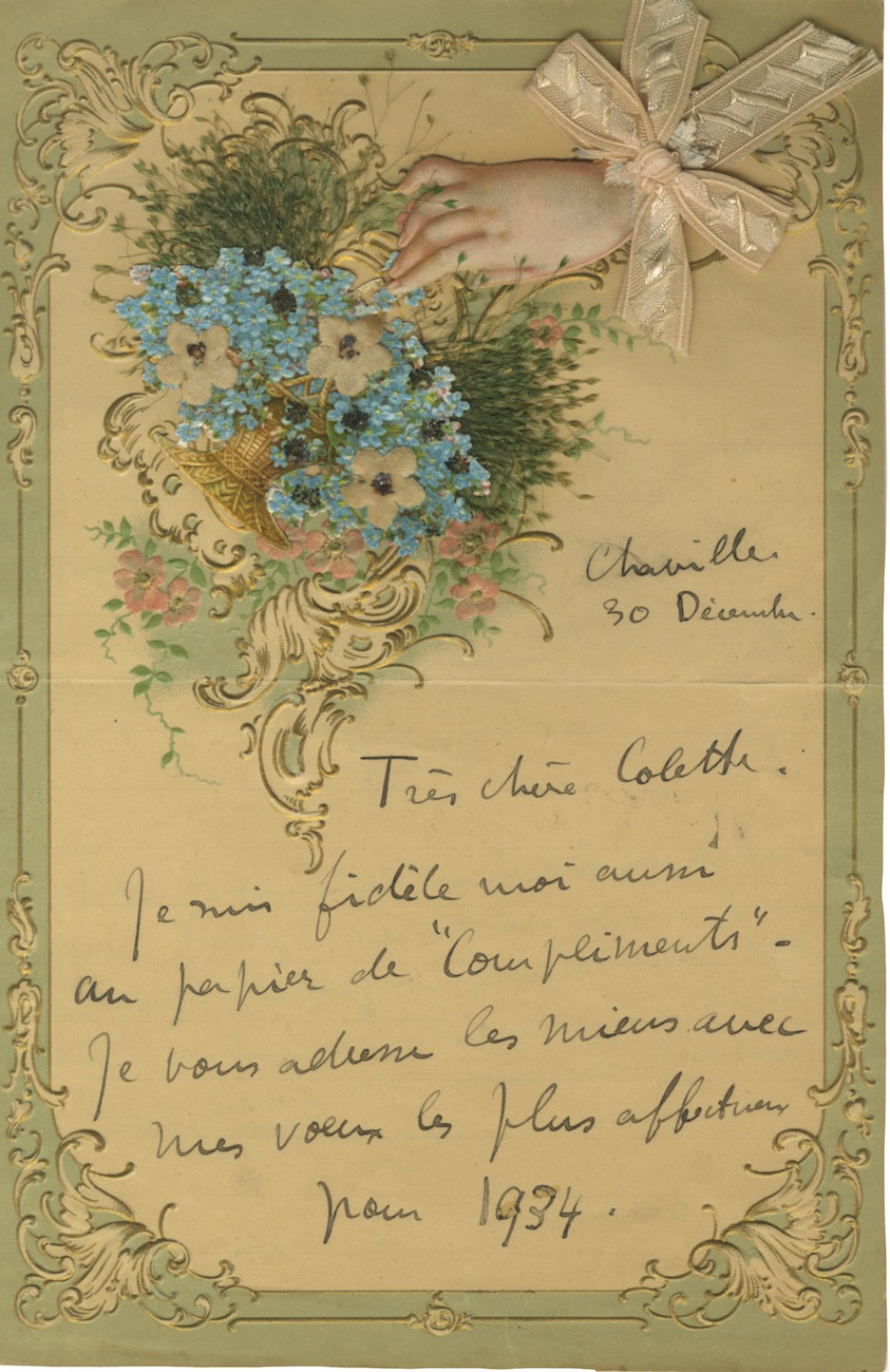 Lettre autgraphe signéeLettre autographe signée adressée à Colette. Chaville, 30 décembre 1933 ; 2 pages in-8° sur papier art-déco, enrichi d’un chromo d’une main tenant une corbeille de fleurs. Petite déchitures dans la fente. ...