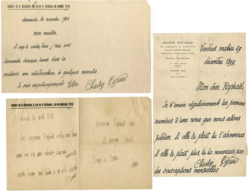 Ensemble de 3 lettres autographes signéesEnsemble de 3 lettres autographes signées : Lettre adressée à Gaston Raphaël. 29 décembre 1899 ; 1 page in-8° à en-tête Société Nouvelle de Librairie et dédition. « Mon cher Raphaël, je tenvoie régulièrement les...