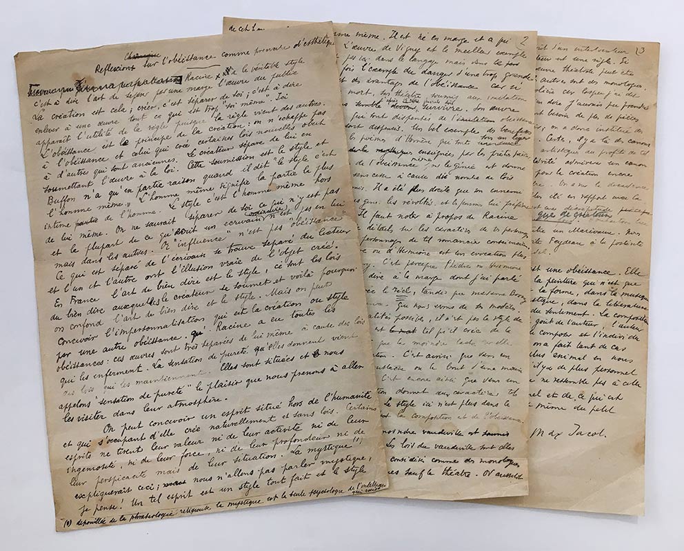 Manuscrit autographe signéManuscrit autographe signé, « Réflexions sur lobéissance comme principe esthétique ». Sans date; 3 pages in-folio.Important manuscrit inédit sur la définition de lart et du style pour Max Jacob. Racine a le véritable style...