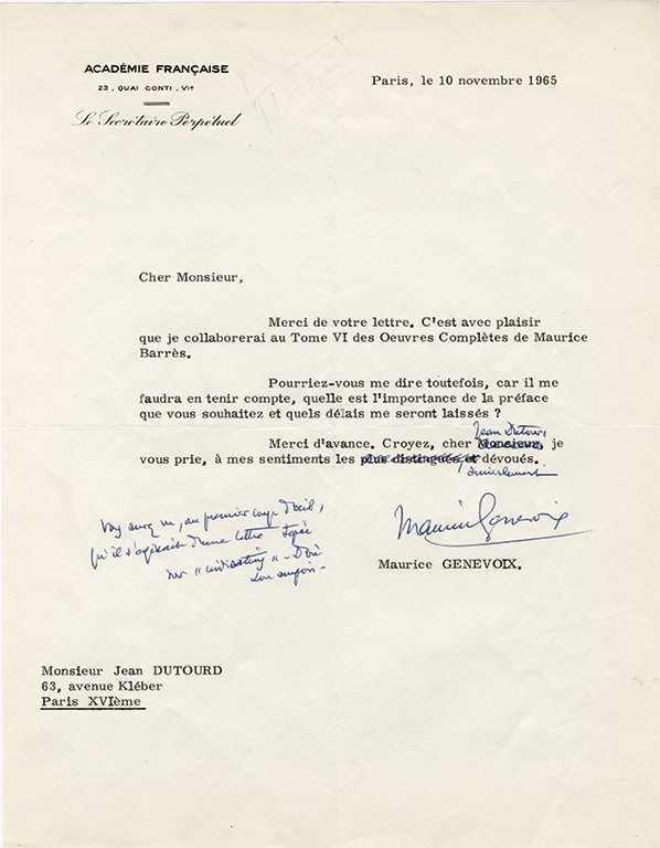 Lettre signéeLettre signée, adressée à Jean Dutourd. Paris, 10 novembre 1965 ; 1 page in-4°. ...
