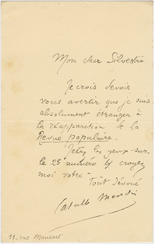 Lettre autographe signéeLettre autographe signée. Sans date ; 1 page in-8°. « Je crois devoir vous avertir que je suis absolument étranger à la réapparition de la Revue Populaire. Jetez les yeux sur le 2 e numéro. »