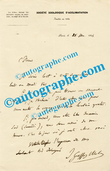 Lettre autographe signéeLettre autographe signée. Paris, le 28 mai 1854 ; 1 page in-8°. En-tête « Société Zoologique d’Acclimatation ». « Je serais tout à votre disposition lundi ou mardi vers 11 h 1/2. Si d’ici là, je puis trouver un moment de...