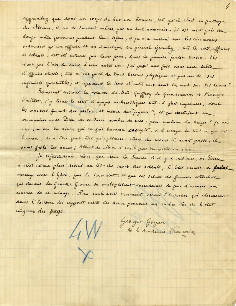 Manuscrit autographe signéManuscrit autographe signé. 4 pages in-folio. Manuscrit sans doute publié au Figaro. « La dernière œuvre d’Albert de Mun. [...] Ces prêtres étaient demandés là où l’on mourait ; mais ils sentaient tous que la France attendait...