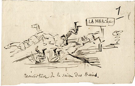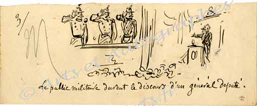 Dessin originalDessin original. Seconde moitié du XIXe siècle. 7 X 18 cm. Dessin paru dans le Charivari. Amusant dessin caricatural légendé : « Le public militaire devant le discours d’un général député. »