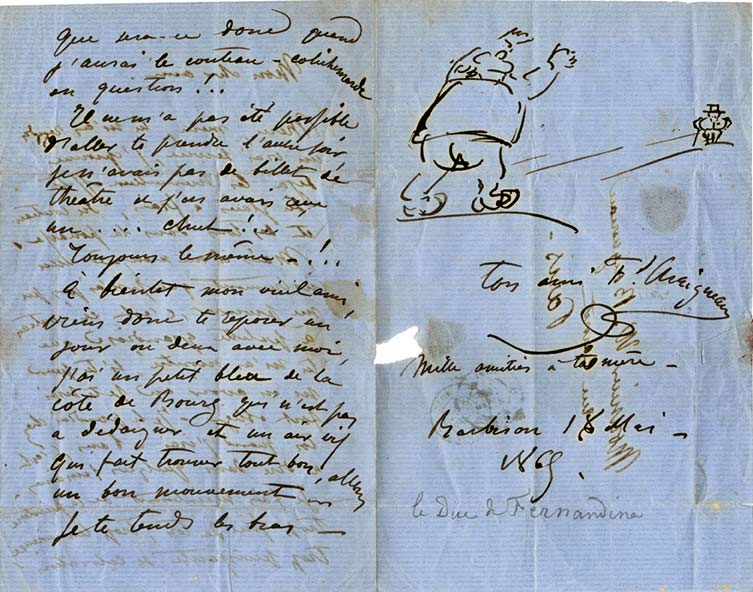 Lettre autographe signée avec DESSINLettre autographe signée, contenant à la fin un dessin original à l’encre, adressée au peintre William Bouguereau, rue Carnot à Paris. Barbizon, 18 mai 1865 ; 3 pages in-8° avec adresse, timbre et cachet postal au verso. « Mon...