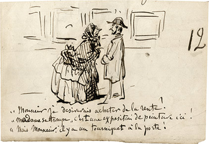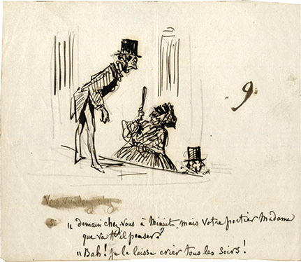 Dessin autographe caricaturalDessin original. [Vers 1869] ; 15 X 13 cm. Dessin paru dans le Charivari. Amusant dessin caricatural légendé « Demain chez vous à Minuit, mais votre portier Madame, que va t'il penser ? Bah je le laisse crier tous les soirs ! »