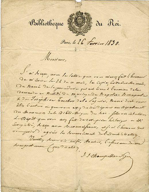Lettre autographe signéeLettre autographe signée [adressée à Jacques-Henri Rudemare]. Paris, 26 février 1830 ; 1 page in-4° sur papier à en-tête de la Bibliothèque du Roi, avec vignette, fentes aux plis....