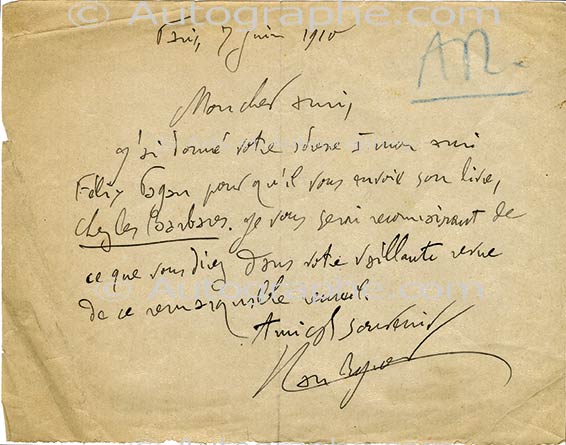 Lettre autographe signéeLettre autographe signée, adressée à un directeur de revue. Paris, 7 juin 1910 ; 1 page in-8° oblongue. Il a donné l’adresse de son correspondant à son ami Félix Fagan (?) pour qu’il lui envoie son livre Chez les barbares.