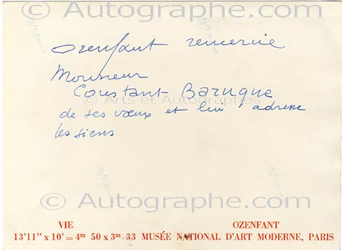Carte autographe signéeCarte autographe signée, à la troisième personne, adressée au peintre Constant Baruque. Sans date ; 1 page in-12 au dos d’une photographie représentant son oeuvre Vie (Musée d’Art moderne de Paris). « Ozenfant remercie Monsieur...