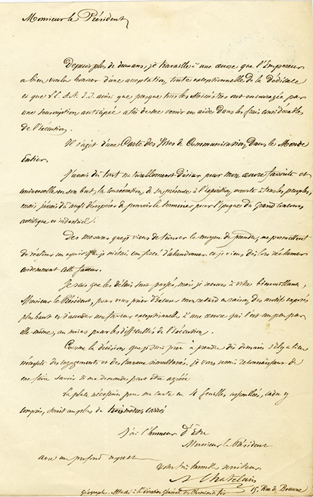 Lettre autographe signéeLettre autographe signée, adressée à un président. Paris, 7 décembre 1854, cachet de l’Exposition universelle. « Depuis plus de deux ans, je travaille à une œuvre que l’Empereur a bien voulu honorer d’une acceptation, toute...