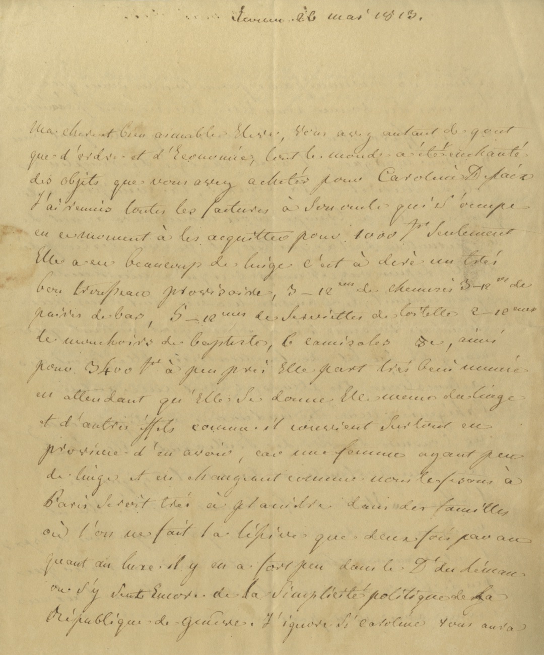 Lettre autographeLettre autographe, adressée à Nancy Macdonald, fille du maréchal Macdonald. Écouen, 26 mai 1813 ; 4 pages in-4°. Très intéressante lettre sur l’habillement des demoiselles de la Légion d’honneur : « Vous avez autant de goût...