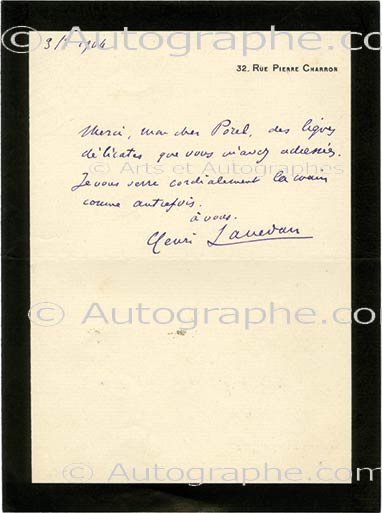 Lettre autographe signéeLettre autographe signée, adressée à M. Porel. [Paris,] 3 janvier 1904 ; 1/2 page in-8°, sur papier de deuil. « Merci, mon cher Porel, des lignes délicates que vous m’avez adressées. Je vous serre cordialement la main comme...