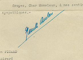 Lettre signéeLettre signée, adressée à Gaston Picard. Champrosay, le 2 décembre 1943 ; 1 page in-4°. « Vous trouverez ci-jointe la biographie et la bibliographie que vous mavez demandées ainsi que la photographie et lautographe. Jai eu du...