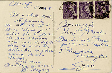 Carte autographe signéeCarte autographe signée, adressée à René Brest. Niort, 5 avril [1943] ; sur carte postale.« La pensée mattriste quà mon retour je naurai plus le plaisir de me retrouver avec vous. Le séjour dans la ville des traboules en...