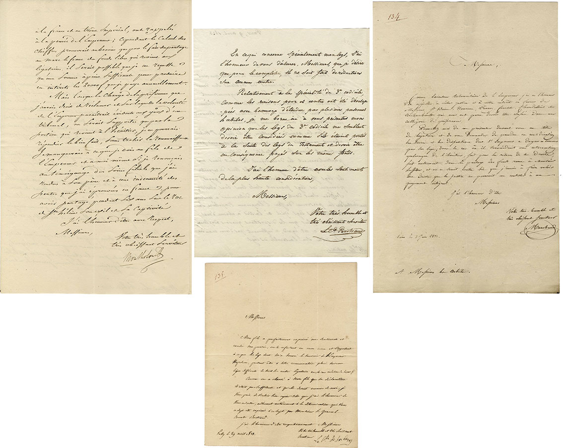 Ensemble de 3 lettres des exécuteurs testamentaires: Montholon, Bertrand, Marchand et une lettre de Las Cases3 lettres des exécuteurs testamentaires: Montholon, Bertrand, Marchand et une lettre de Las Cases, adressées aux arbitres de la succession. (Provenance ventes des archives Bertrand-Drouot)...