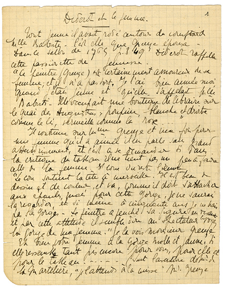 Manuscrit autographeManuscrit autographe sur Diderot. Ensemble de 14 pages in-4°, recto-verso, numérotées au crayon 1 à 12; avec des têtes de paragraphes. Il cite beaucoup Diderot : « Diderot et les femmes ». 1 page 1/2 in-4°.« Tout jeune il...