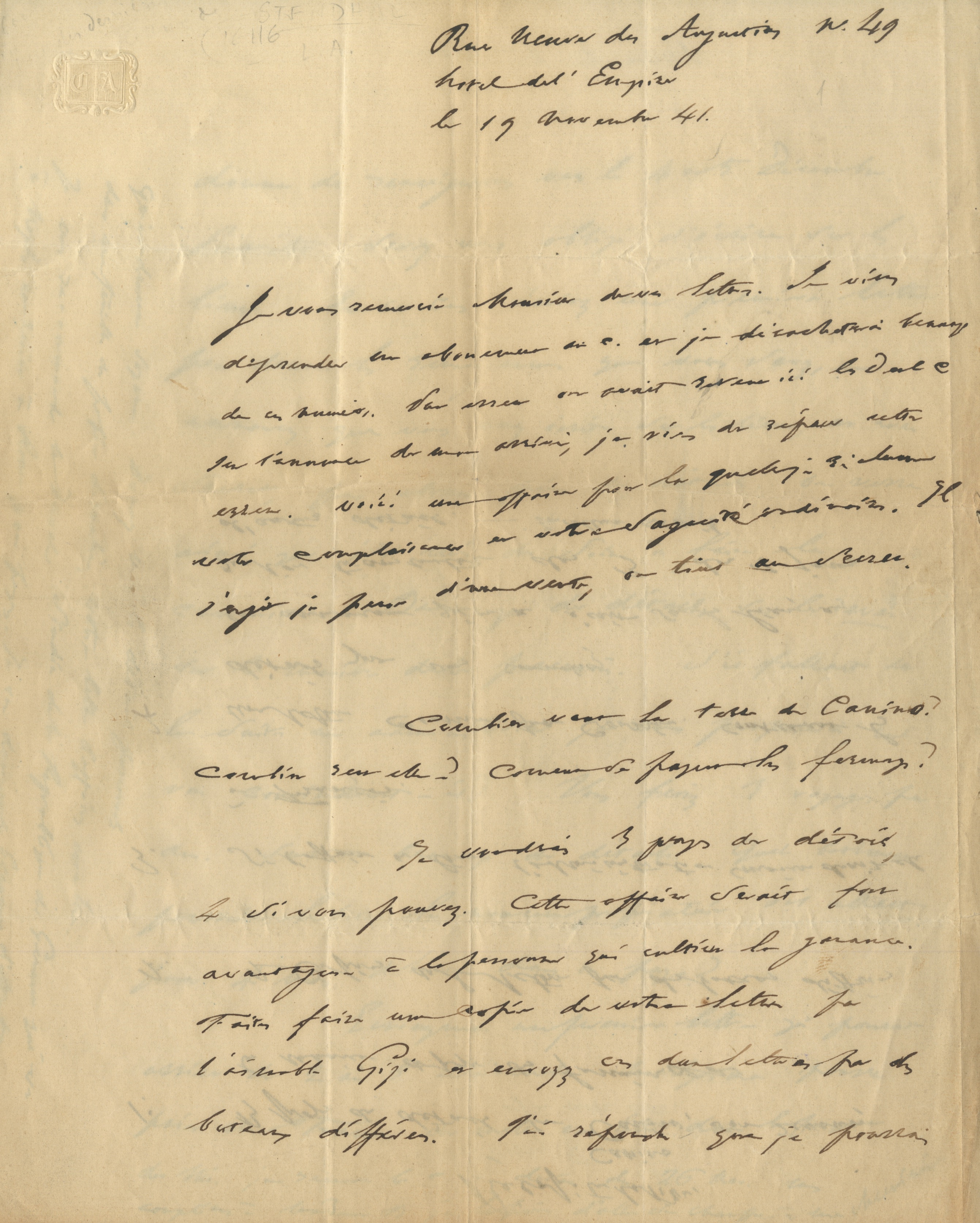 Lettre autographelettre autographe adressée à Donato Bucci à Civitavecchia. [Paris], 19 novembre 1841 ; 3 pages petit in-4, adresse. ...