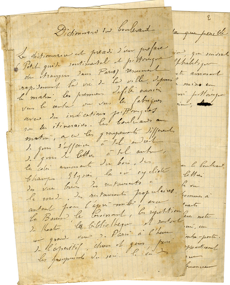 Manuscrit autographe signéManuscrit autographe intitulé « Dictionnaire du boulevard ». 4 pages 1/2 in-8°. Chronique destinée à paraître dans un journal. « Le dictionnaire est précédé d’une préface (Petit guide sentimental et pittoresque des...