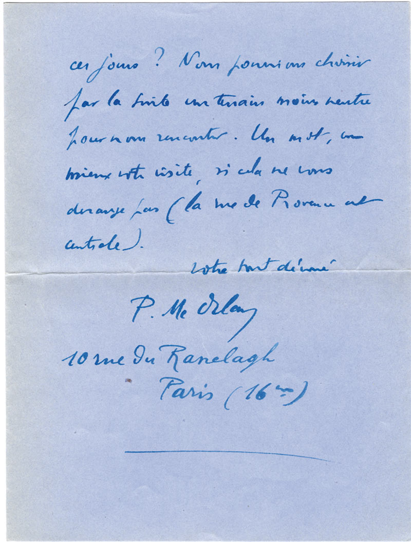 Lettre autographe signéeLettre autographe signée, adressée à Jean Lassaigne. Paris, mardi ; 1 page 1/4 in-8°, en français.« J’aurais été heureux de vous voir. Mais je reviendrai bientôt à Paris. Je vous remercie encore une fois de votre très beau...