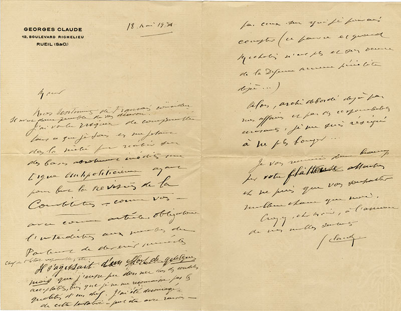 Lettre autographe signéeLettre autographe signée, adressée à M. Verdavainne. Rueil, 18 mai 1934 ; 2 pages in-8° sur papier à son adresse, enveloppe jointe. « Nos sentiments de Français coïncident. Il m’est donc pénible de vous décevoir. J’ai voulu...