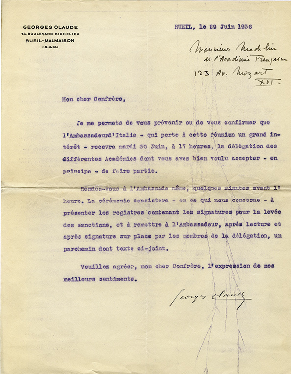 Lettre signéeLettre signée, adressé à Louis Madelin. Rueil-Malmaison, 29 juin 1936 ; 1 page in-4°. En-tête gravé à son nom et adresse.« Je me permets de vous prévenir ou de vous confirmer que lAmbassade dItalie qui porte à cette...
