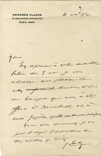 Lettre autographe signéeLettre autographe signée. 16 novembre 1930 ; 1 page in-8°. En-tête gravé à son nom et adresse. « En réponse à votre aimable lettre du 8 novembre, je vous adresse un phrase de mon discours d'hier au banquet qui nous a été offert...