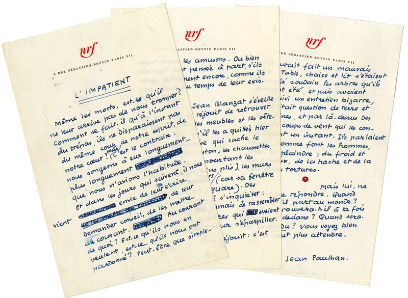 Manuscrit autographe signéManuscrit autographe signé, intitulé « L’impatient ». Sans date : 3 pages in-8°, en-tête « NRF ». « Même les morts, est-ce qu’il ne leur arrive pas de nous tromper ? Comment se fait-il qu’à l’instant du trépas, ils ne...