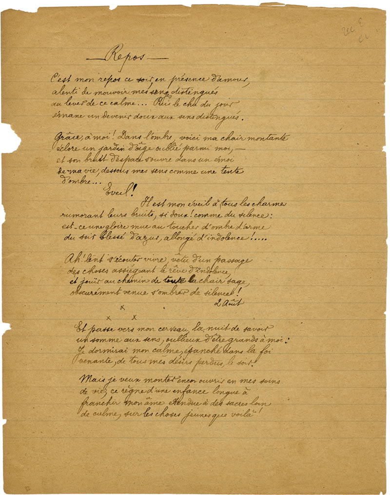 3 poèmes autographes3 poèmes autographes, « Travail », « Repos » et « Louise ». Juillet-août [1895] ; 3 pages 1/2 in-4°. Papier fragile, légères fentes.Rares poèmes de jeunesse.« Travail » (26 juillet) se compose de 8 quatrains :« Et...