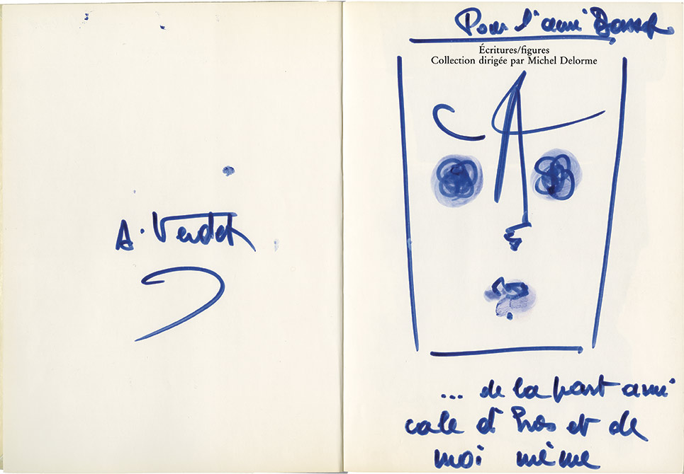 Livre avec envoi avec dessin« Langue dEros ». Illustré de 34 encres de Chine de Paul Jenkins. Éditions Galilée, Paris, 1985, broché, 23 x 17 cm, 94 pages. Bel envoi autographe signé, illustré dun dessin dAndré Verdet et un envoi autographe signé du...
