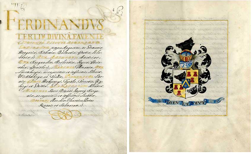 Diplôme de chevalier du Saint-EmpireDiplôme de chevalier du Saint-Empire, décerné à M. Erasme Fovllok, signé par Ferdinand III. Donné le 5 juillet 1653 ; 13 pages in-4° (255 x 305 mm) dont 1 page avec armoiries. Le manuscrit est relié sous une couverture en velours...