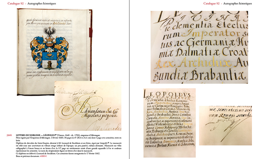 Pièce signéePièce signée par lEmpereur dAllemagne. 3 février 1660 ; 18 pages in-4° (255 x 305 mm) dont 1 page avec armoiries, texte en latin. Diplôme de chevalier du Saint-Empire, décerné à M. Leonard de Stockhem et ses frères, signé par...