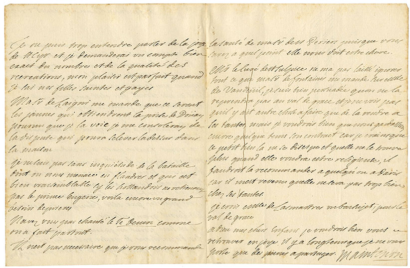 Lettre autographe signéeLettre signée, adressée à la supérieure de la Maison royale de Saint-Louis [Marie de La Poipe de Vertrieux], à Saint-Cyr. Fontainebleau, le 10 août 1712 ; 3 pages in-4°, adresse. La lettre a été dictée à sa secrétaire...