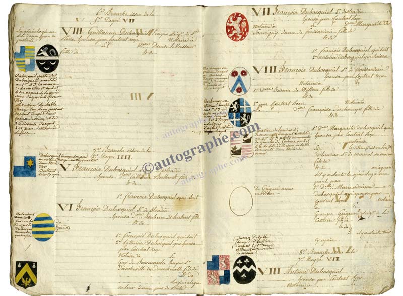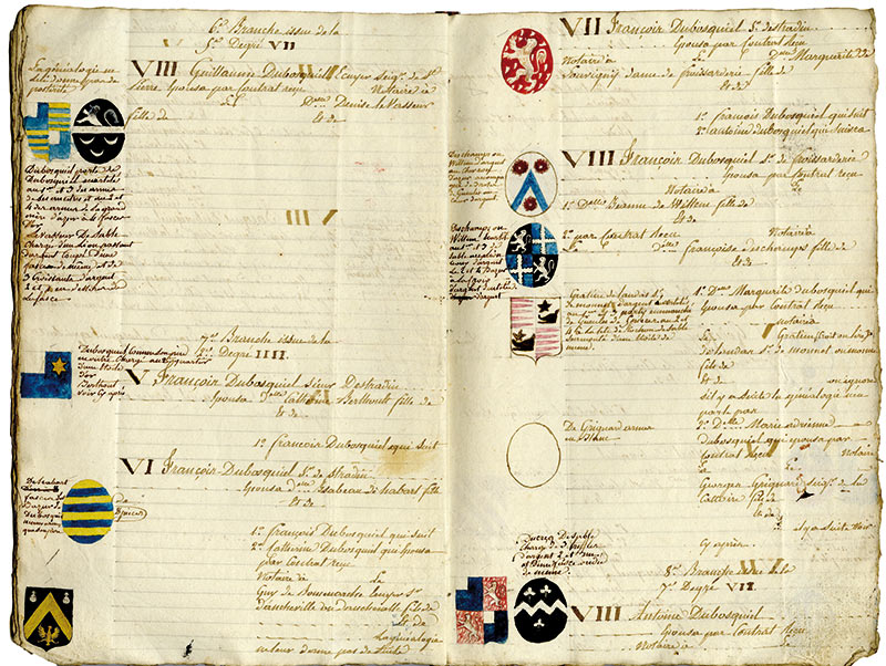 Manuscrit de la première moitié du XIXe« Généalogie de la famille du Bosquiel ». Manuscrit de la première moitié du XIXe siècle en un cahier in-4° de 16 feuillets. Environ 110 blasons peints en marge du texte. Quelques blasons se présentant sous la forme de cartons....