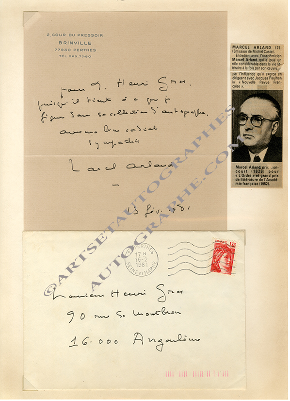 Lettre autographe signée, adressée àLettre autographe signée, adressée à Henri Gros. Perthes, 13 février 1981 ; 1 page in-8°, enveloppe timbrée jointe.« Puisqu’il tient à ce que je figure dans sa collection d’autographes. »