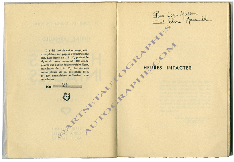 « Heures intactes, poèmes»« HEURES INTACTES, POÈMES ». Éditions Les Cahiers du Journal des poètes, Paris, 1936 ; édition originale, 1/100 exemplaires numérotés sur papier Featherweight fort portant le signe du cœur couronné (n°24). Envoi autographe signé...