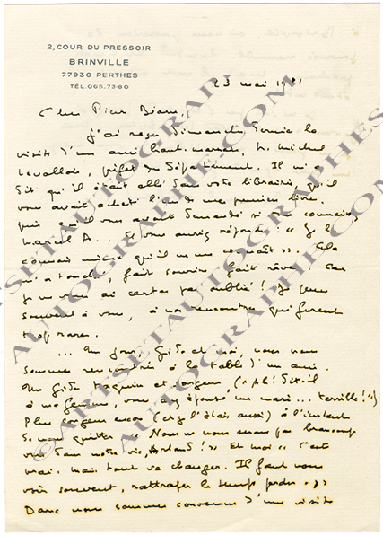 Lettre autographe signéeLettre autographe signée, adressée à Pierre Béarn. Brinville, 23 mai 1981; 1 page in-8°. Un ami de Marcel Arland ayant trouvé son premier livre dans la librairie de Pierre Béarn, rue Monsieur-le-Prince, le poète-libraire lui aurait...