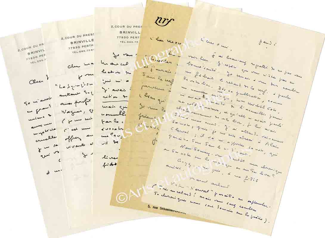 Lettres autographes signéesEnsemble de 5 lettres autographes signées, dont 4 adressées à Marcel Schneider. De 1981 à 1985 ; formats in-8° :— « Je tenais à vous dire combien me fâchait le retard de la NRF à parler de votre livre. Dès sa publication, comme...
