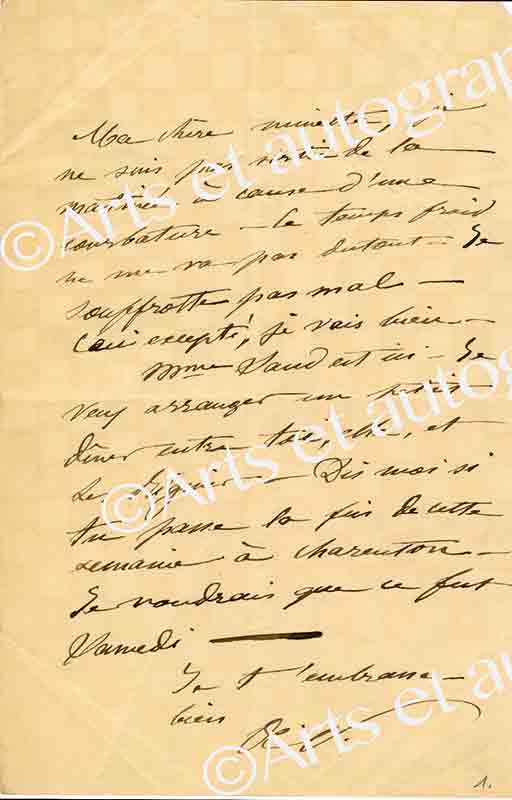 Lettre autographe signéeLettre autographe, signée de ses initiales, adressée à Mme Berton. Sans date ; 1 page in-12. « Ma chère Minette, je ne suis pas sortie de la matinée à cause d’une courbature — le temps frais ne me va pas du tout. Je souffrotte...
