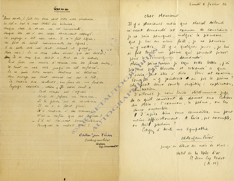 Lettre autographe signéeLettre autographe signée, adressée à André Berge. « Lundi 8 février 26 » ; 1 page in-8°. « Il y a plusieurs mois que Marcel Arland m’avait demandé cet examen de conscience : je ne sais pourquoi, malgré la promesse que je lui en...