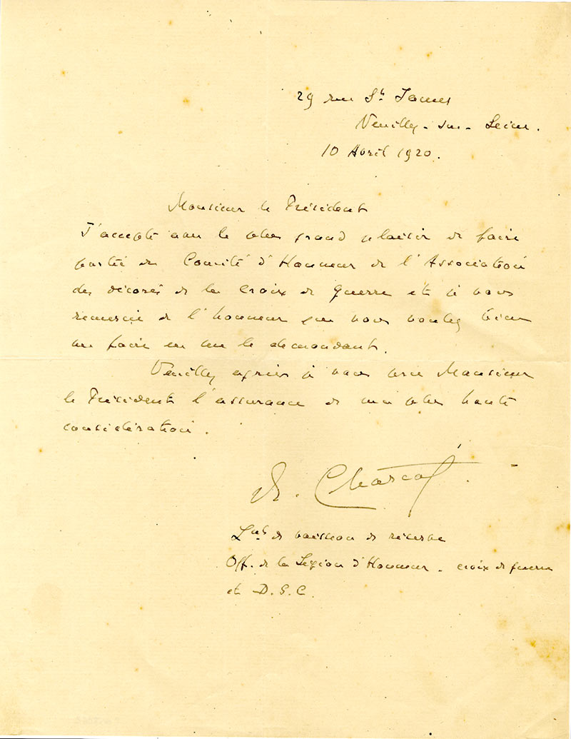Lettre autographe signéeLettre autographe signée, adressée à M. Pérignon, président de l’Association amicale des Croix de Guerre 1914-1919. Neuilly-sur-Seine, 10 avril 1920 ; 1 page in-4°. « J’accepte avec le plus grand plaisir de faire partie du...