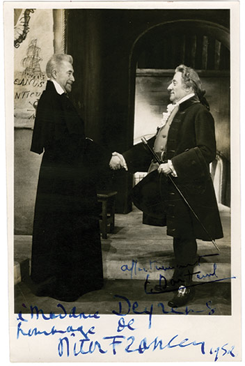 Photographie autographe signée, dédicacéePhotographie par Georges Henri, représentant Victor Francen, dans une scène de théâtre, avec dédicace : « À Madame Deyrens, hommage de Victor Francen. 1952. »