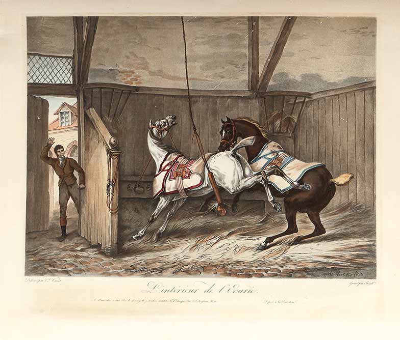 Chevaux dans l’ecurieIntérieur de l’écurie. Gravure de Jazet d’après une peinture de Carle Vernet. Estampe à l’aquatinte en couleurs, collée sur un support cartonné. Tirage ancien du début du XIXe siècle ; 50 x 59,5 cm. Accrocs minimes ne nuisant...