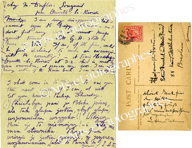 Ensemble de 3 cartes autographes signées.Ensemble de 3 cartes autographes signées.2 cartes sans vues ; la troisième représentant une photographie du peintre devant son chevalet. Deux des cartes (rédigées en allemand et en polonais) sont envoyées à Mme E. Henschel 9 rue...