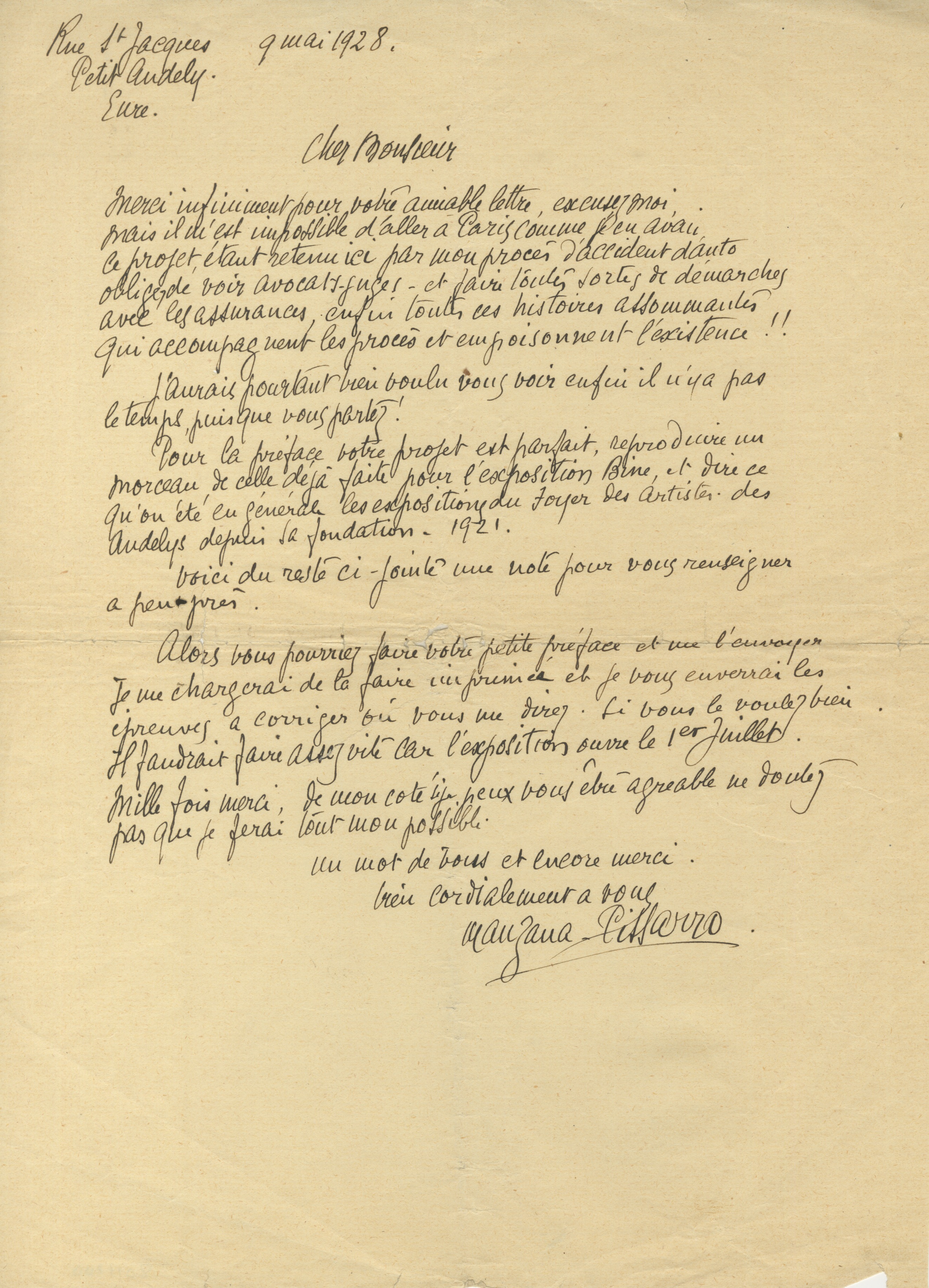 41209Lettre autographe signée, [adressée à Claude Roger -Marx]. Petit-Andely (Eure) mai 1928 ; 1 page in-4°, trace de pliure. Il s’excuse de ne pouvoir se déplacer car il doit s’occuper de son procès d’accident d’auto. ...