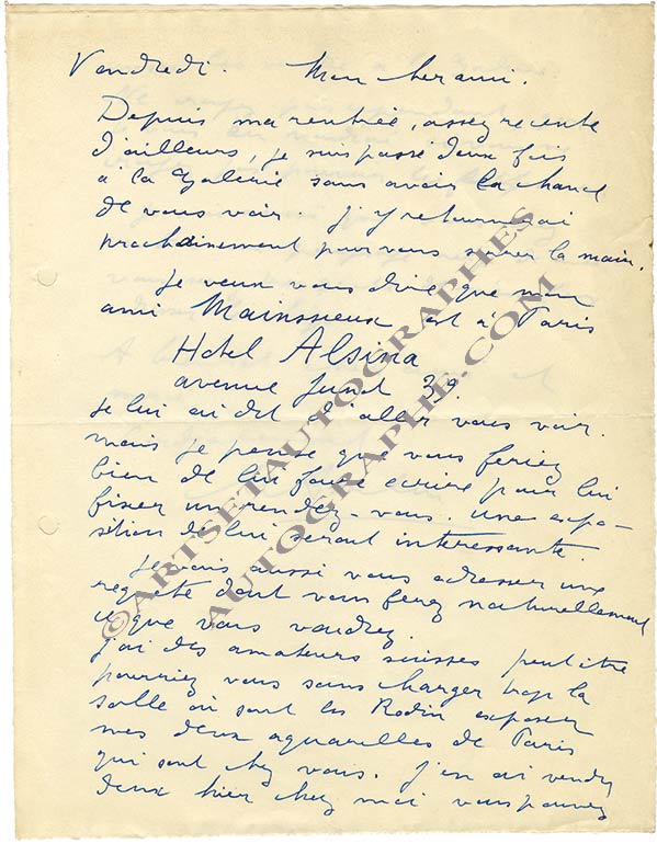 Lettre autographe signéeLettre autographe signée, adressée à Raymond Nacenta, directeur de la galerie Charpentier. « Vendredi » ; 1 page 1/2 in-4°, trous d’archivage. « Je veux vous dire que mon ami Mainssieux est à Paris […]. Je lui ai dit d’aller...